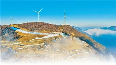 湖北省宜昌市五峰土家族自治县独岭风电场,一座座风力发电机矗立在山脊之上,清洁能源设施与壮美的高山云海相映成趣。