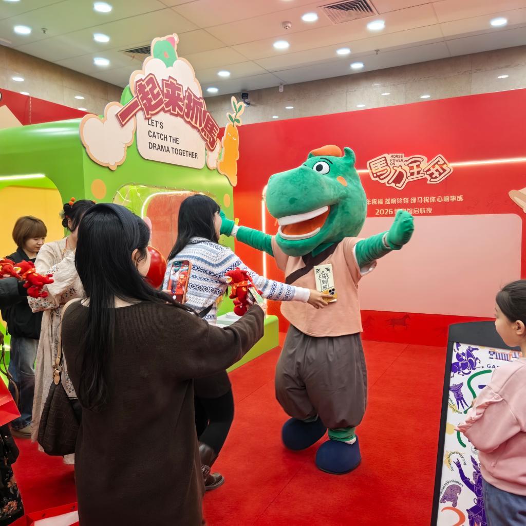 甘肃省博物馆内的“抓马”市集里,年轻游客排队争相与“绿马”人偶合影留念。新华社记者李杰 摄