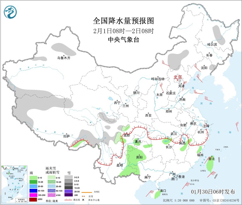 全国降水量预报图(1月31日08时-2月1日08时) 图片来源:中央气象台网站
