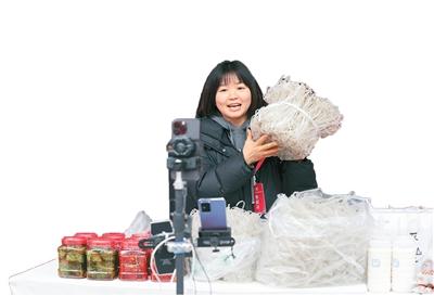 在重庆市黔江区“832平台”优选年货暨“农合联”特产嘉年华活动上,商家在直播销售红苕粉。