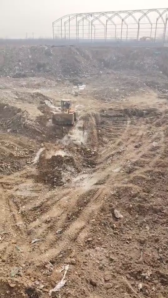 现场可见深坑部分区域已被垫高,土层中可见垃圾与黄土交替覆盖的压实痕迹。坑体边缘仍有未及掩埋的垃圾暴露在外。
