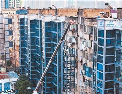 近年来,湖北襄阳将老旧小区加装电梯作为重要民生实事扎实推进,助力城市更新。图为工人在一小区为旧楼加装电梯。
