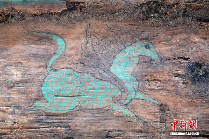 新疆吐鲁番市巴达木东晋唐时期墓群出土棺木上展翅的飞马。中新网记者 孙自法 摄