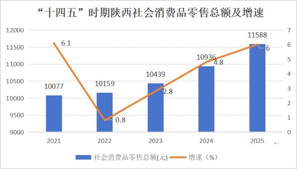 消费市场稳定作用增强。“十四五”时期,陕西累计社会消费品零售总额53198.69亿元,是“十三五”时期的1.2倍。2025年,社会消费品零售总额11587.99亿元,同比增长6%。