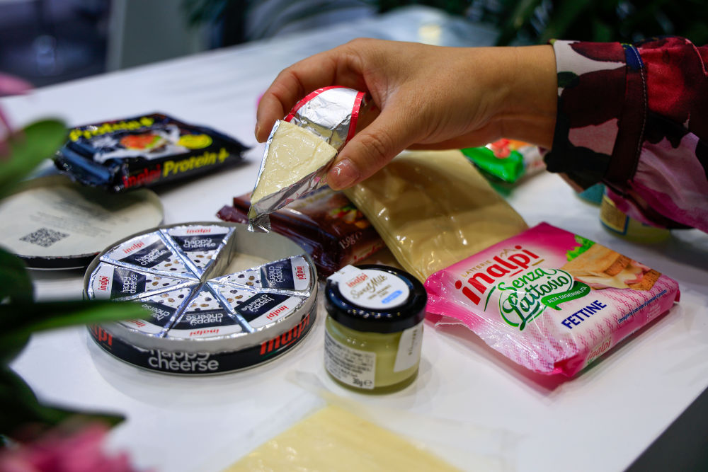 这是2025年11月9日在第八届进博会农食产品展区拍摄的意大利伊纳尔皮集团(Inalpi)的奶酪和黄油。