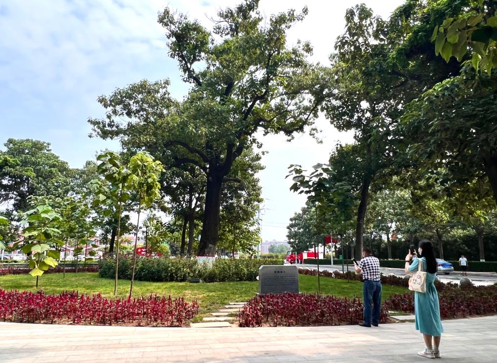 在河南省开封市兰考县焦裕禄干部学院门口,人们在“焦桐”下参观(2022年8月15日摄)。新华社记者 郝源 摄