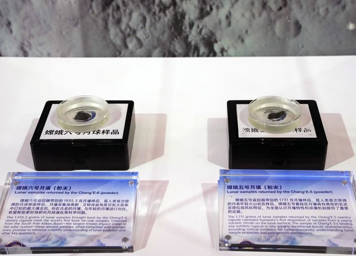 2025年11月5日在第八届进博会国家展中国馆拍摄的“嫦娥五号”月壤和“嫦娥六号”月壤。新华社记者 刘颖 摄
