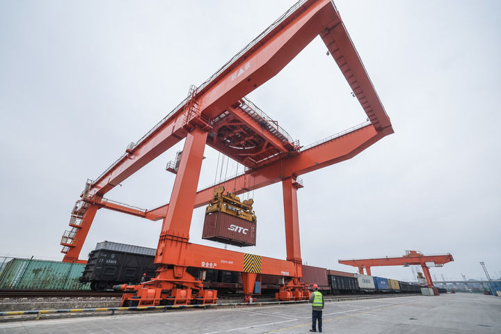 2026年1月30日,在义乌铁路口岸,一列载着进口商品的中欧班列回程班列在卸货。新华社记者 徐昱 摄