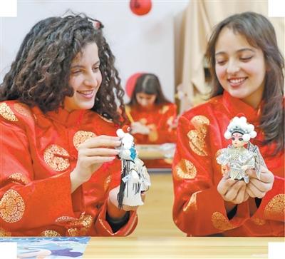 2月8日,山东科技大学举办“非遗里的中国年”文化体验活动,两名外国留学生在展示自己制作的绢人工艺品。