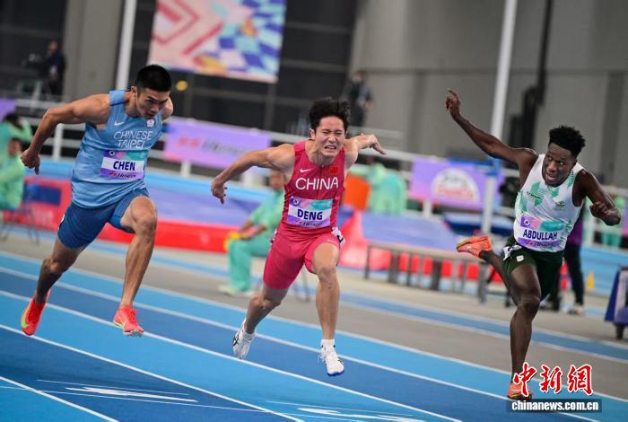 2月6日晚,天津,中国选手邓信锐(中)在男子60米决赛中以6秒59成绩夺冠。 中新社记者 佟郁 摄