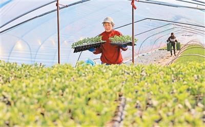 安徽省安庆市宿松县省属农垦华阳河农场西瓜种植基地,工人们忙着起运瓜苗,抢抓农时种植西瓜。