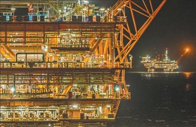 图为夜幕下,锦州23—2油田平台灯火通明。