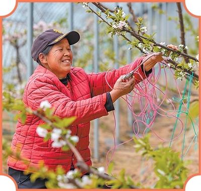 山西省运城市平陆县的现代农业采摘园内,果农对樱桃树进行授粉作业。
