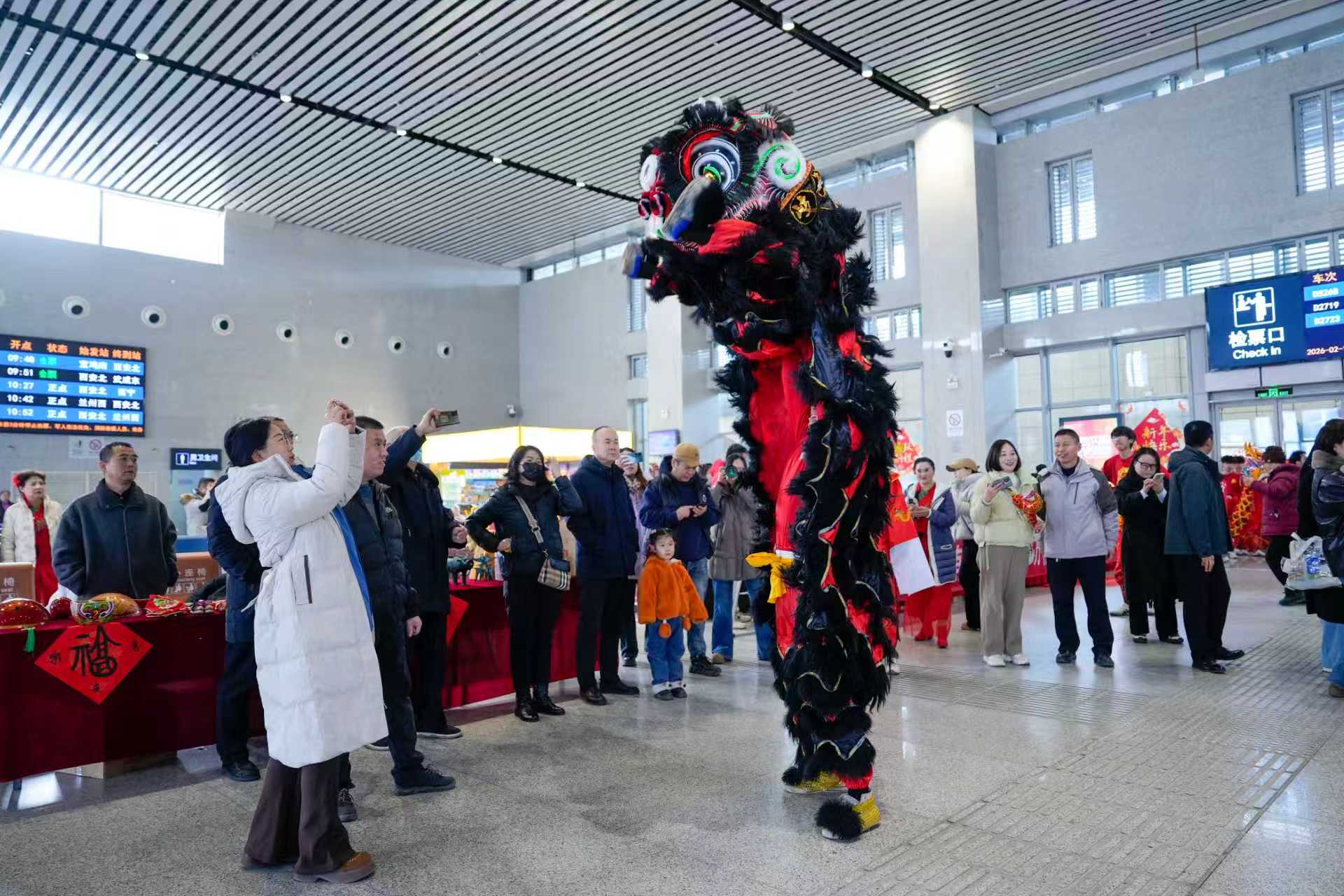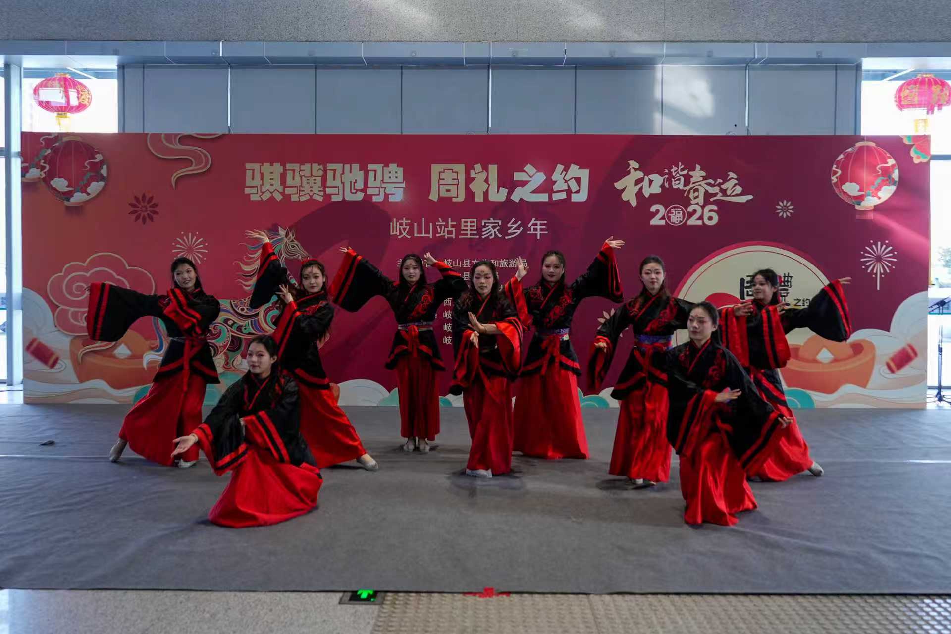 2026年2月10日(农历小年)上午,岐山站候车室内暖意融融、年味渐浓。红红火火的灯笼、喜气洋洋的中国结,搭配剪纸、刺绣等特色周礼文化元素,将春运旅途装点得格外温馨。伴随着热闹的锣鼓声,“骐骥驰骋周礼之约”主题活动正式启幕,为南来北往的旅客送上来自周礼之乡的新春问候与温情祝福。
