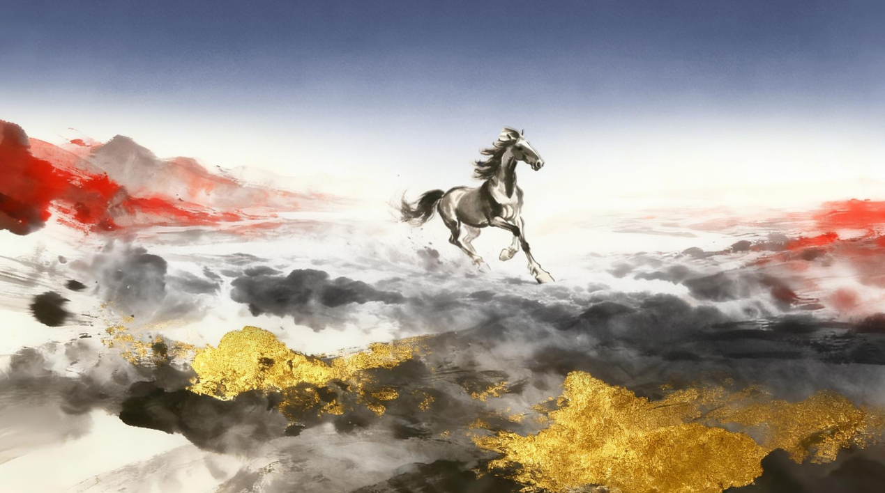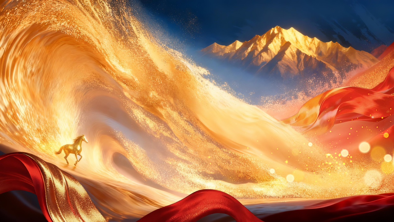 2026 新疆国际春晚首创性地将徐悲鸿大师笔下的水墨骏马通过AICG“活化”,从画卷中奔腾而出,穿越天山、昆仑、丝路时渐变成金色,带着金色浪潮奔涌向前。骏马奔腾,既是新疆发展的速度与力量,更是中国精神的昂扬姿态。