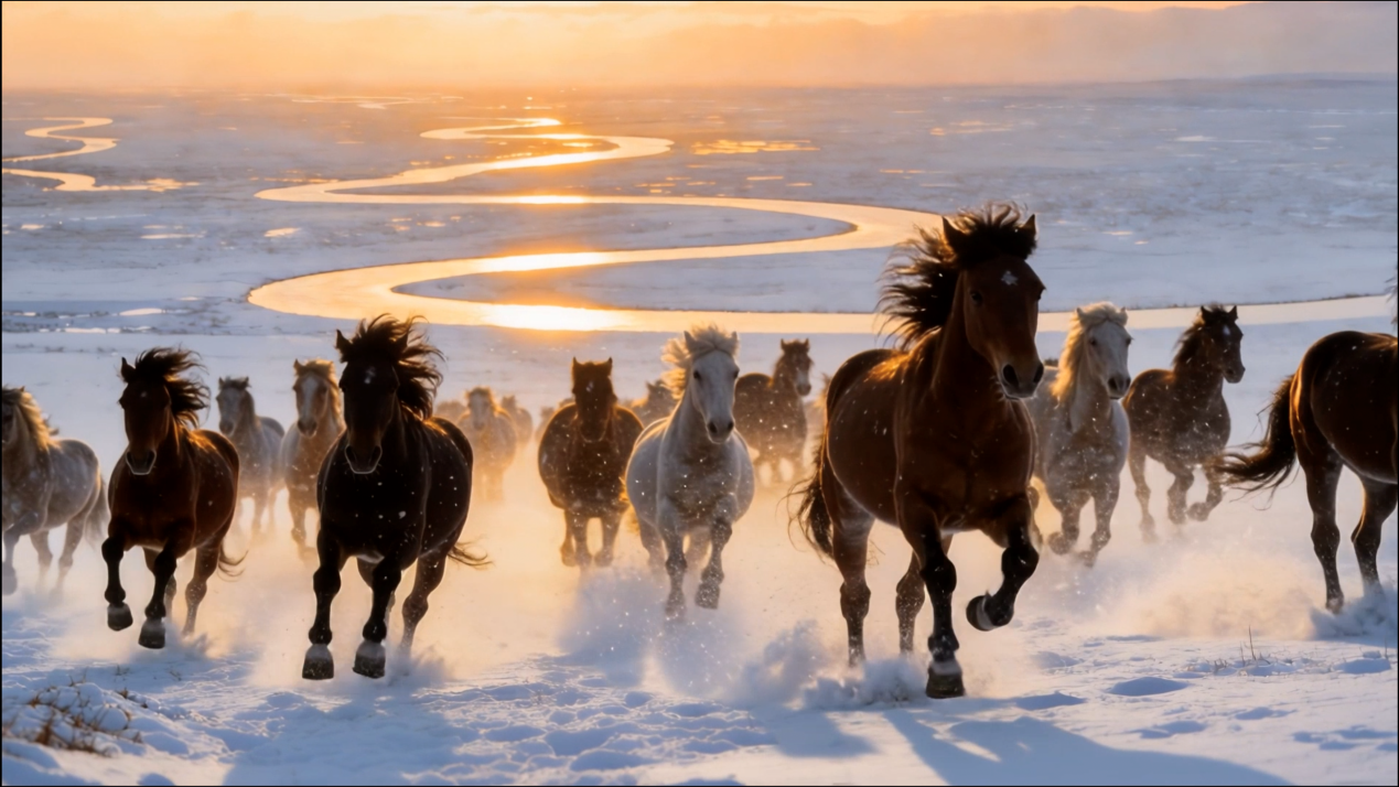 极致冬景之中,万马奔腾踏雪而来。各民族青年闪现其中,展现各民族共同家园的全域图景。