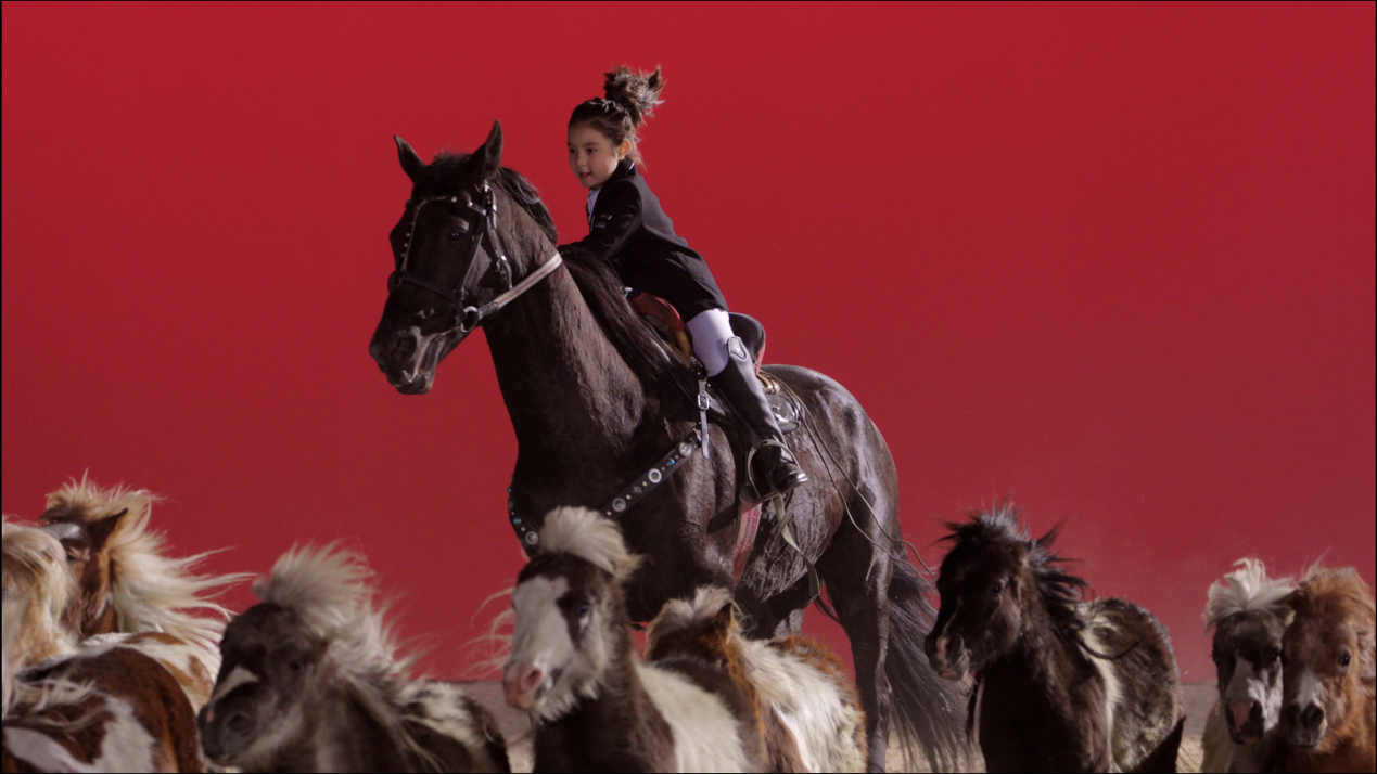 汗血宝马基地,各民族骑手纵横驰骋,5岁萌娃小麦宝贝迎风策马,五色汗血宝马恣意飞奔。