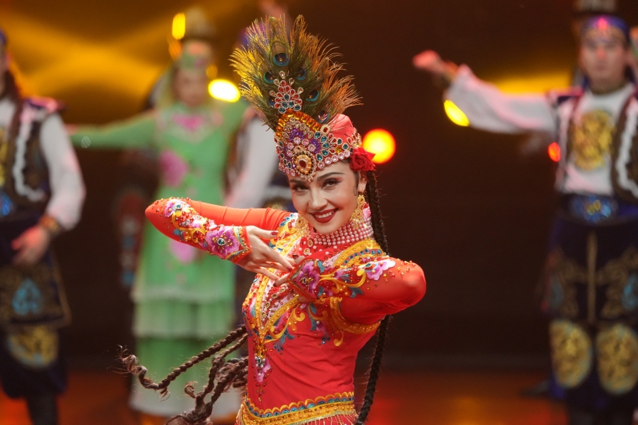 顶尖舞者和新疆各民族舞团同台共舞,舞步点燃全场,多元一体的艺术魅力,淋漓尽致。