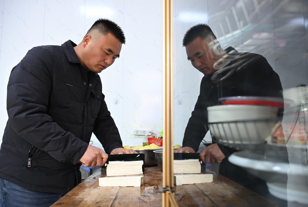 2月6日,庞富强在家中准备当天的午饭。 新华社记者李一博 摄