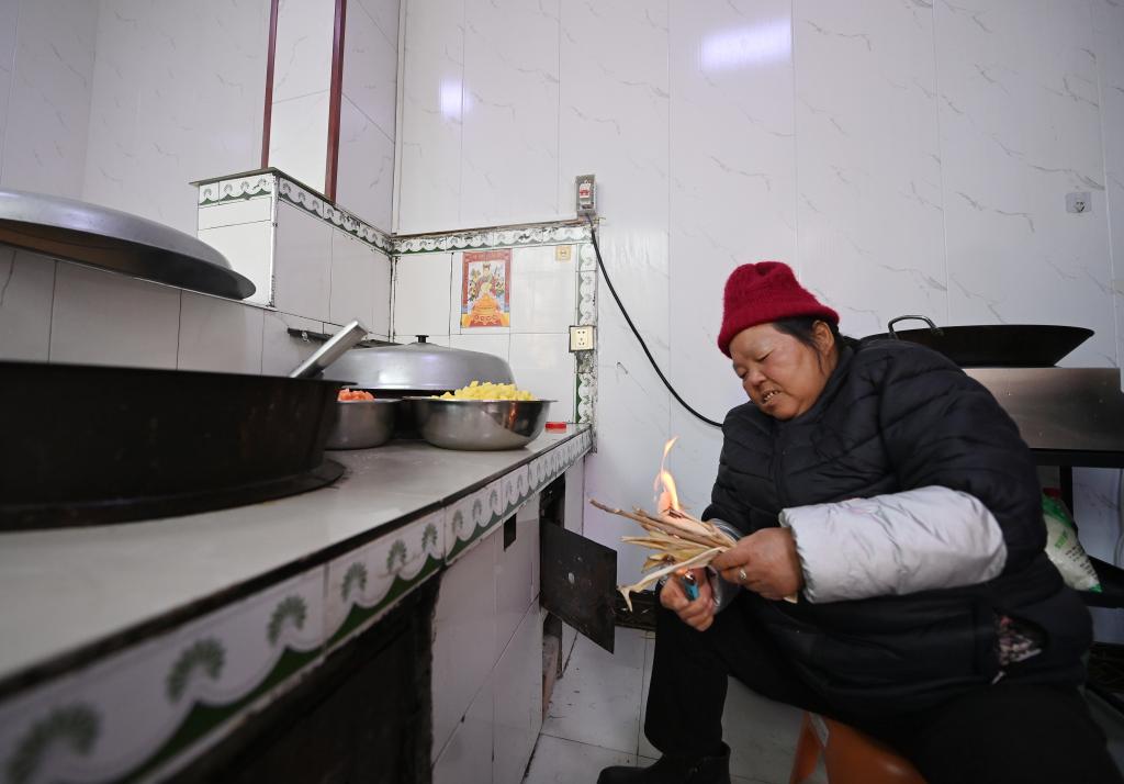 2月6日,庞富强的母亲唐水叶在厨房烧灶。新华社记者李一博 摄