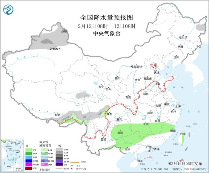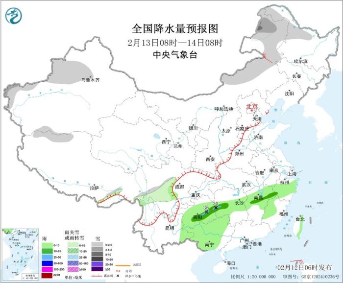 图1 全国降水量预报图(2月12日08时-13日08时)图片来源:中央气象台网站