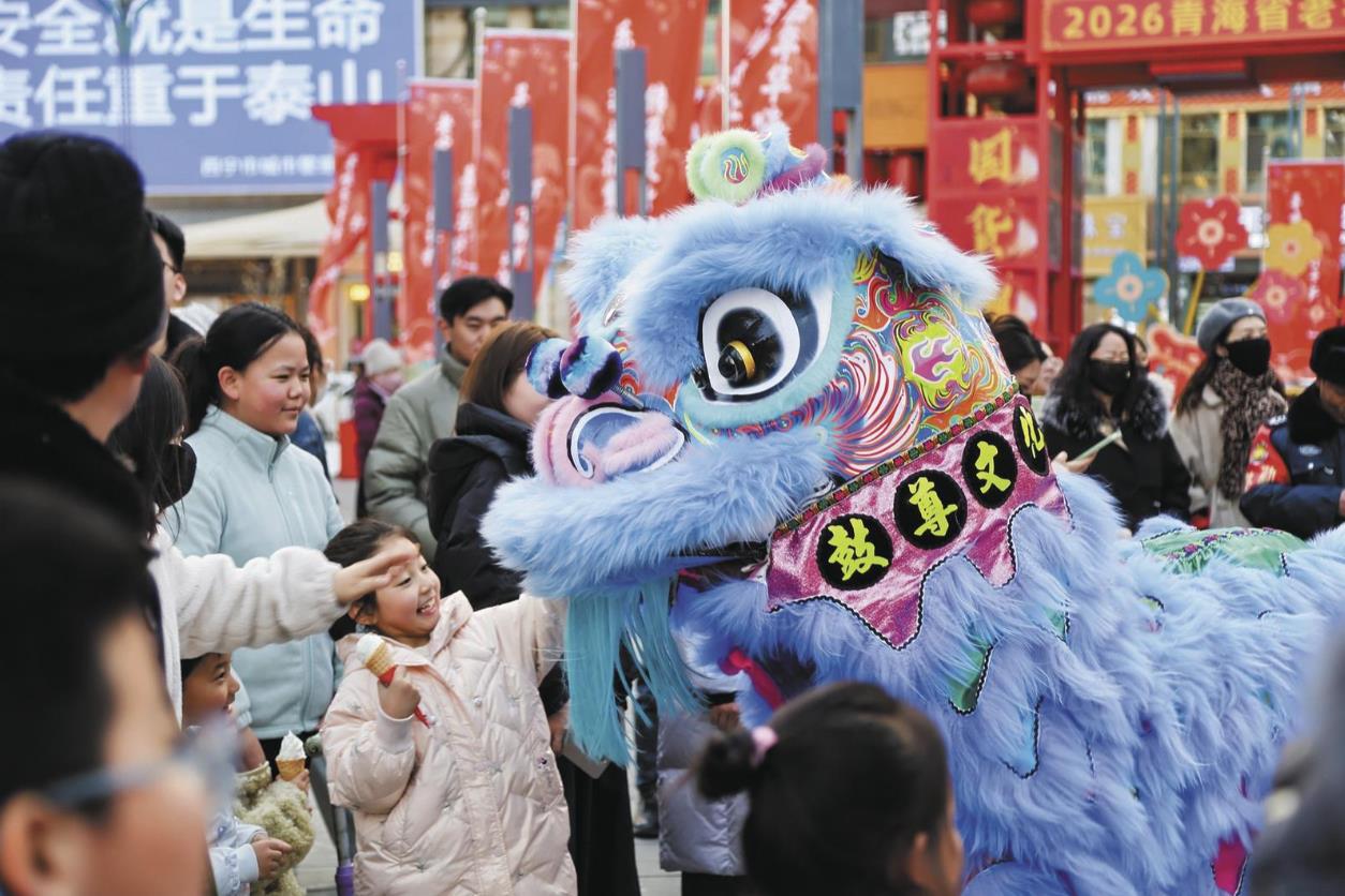 此外,一系列特色活动让新春消费的场景更鲜活、更有趣。“酒韵青海·拳王争霸”现场,市民们围在一起看猜拳行令,喝彩声此起彼伏,现场还能品鉴青稞酒、了解传统酿造技艺;“匠心臻品·新春竞拍”以一元起拍的方式,拍卖老字号产品、特色手工艺品,吸引了不少收藏爱好者参与;舞龙舞狮、民族歌舞、雪豹宁萌IP互动等街区巡演,让整个商业步行街变成了沉浸式的新春体验场,网红打卡点前的一张张合影,定格了高原新春的热闹与美好。