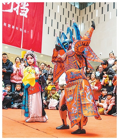 舞台上,人形机器人身着婺剧戏服带来开场秀。随后在一位婺剧演员的指导下,机器人又展示了经典的耍枪动作,现场爆发出热烈的欢呼声。此外,现场不仅有人形机器人演绎传统婺剧、智能机器狗拉车、机械臂挥毫写春联等趣味科技秀,还集结了点翠、板凳龙、婺剧脸谱、非遗鱼灯等特色传统文化展示,让市民游客沉浸式感受传统与科技的交融之美。