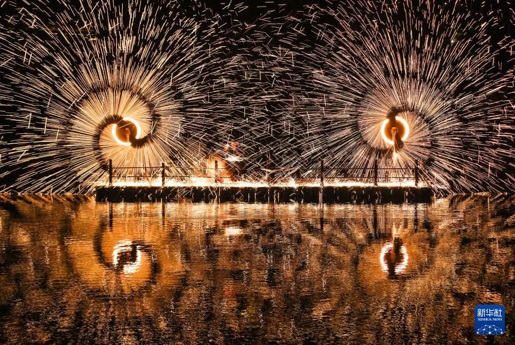 2月13日,在湖南省衡阳市南岳区1944景区,民间艺人表演打铁花。