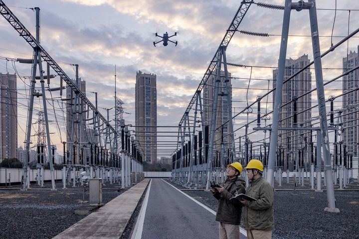 2月17日,国网泰州供电公司运维人员在220千伏寺巷变电站利用无人机巡检电力设备。新华社发(汤德宏 摄)
