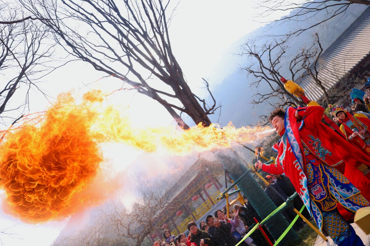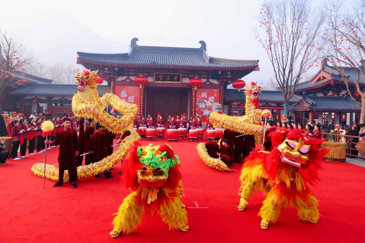 上午九时,华清宫望京门外早已人声鼎沸、气氛热烈。伴随着铿锵激昂的鼓点,一场气势恢宏的舞龙舞狮表演率先点燃全场。金龙翻腾、雄狮灵动,腾跃之间送出吉祥如意的美好祝愿,引得游客阵阵喝彩,将现场气氛一次次推向高潮。