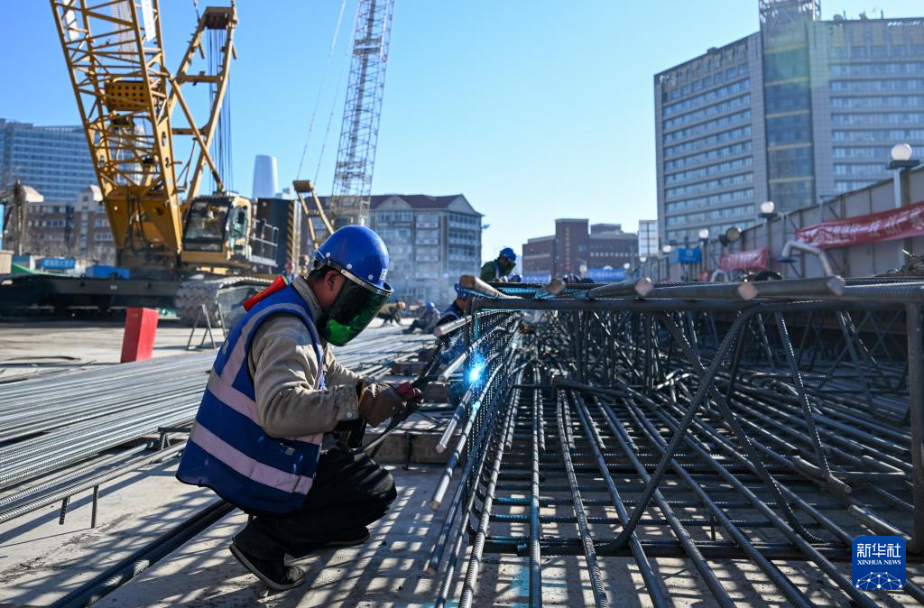 2月18日,施工人员在天津地铁八号线一期工程六里台站建设现场进行钢筋笼焊接作业。