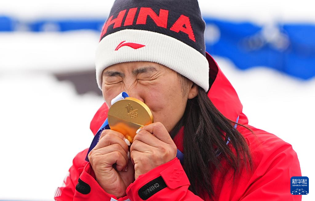2月18日,中国选手徐梦桃在颁奖仪式上亲吻金牌。