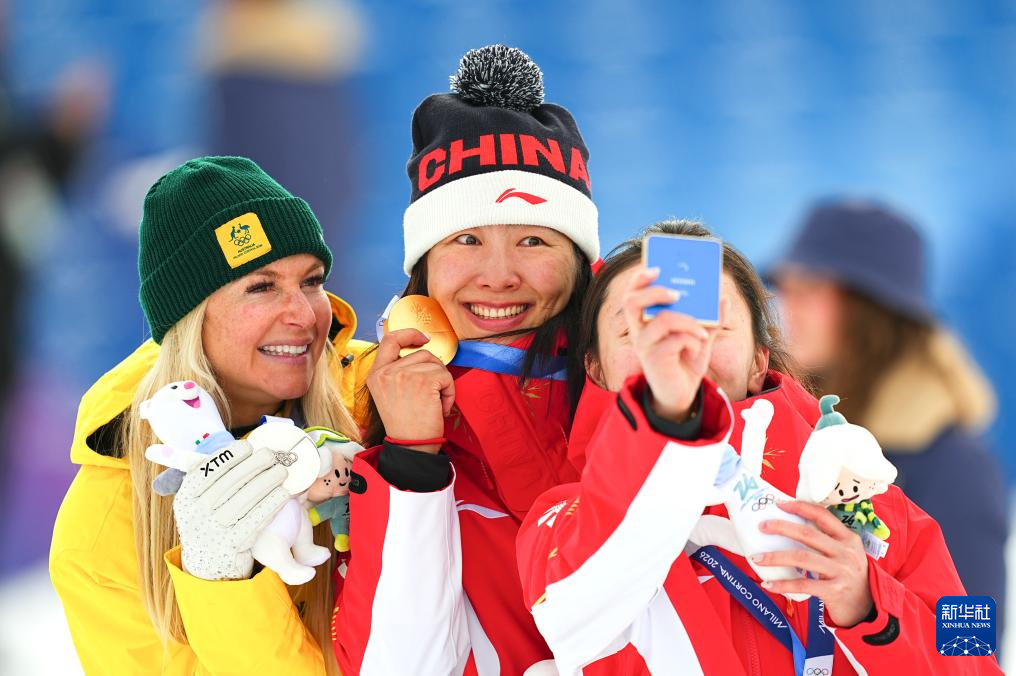 2月18日,冠军中国选手徐梦桃(中)、亚军澳大利亚选手丹妮尔·斯科特和季军中国选手邵琪(右)在颁奖仪式上合影。