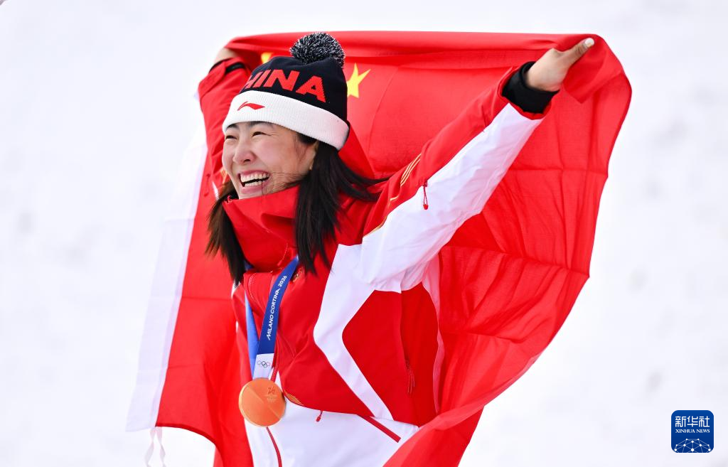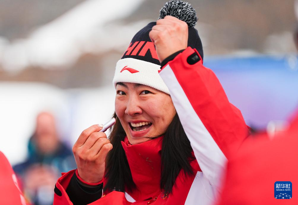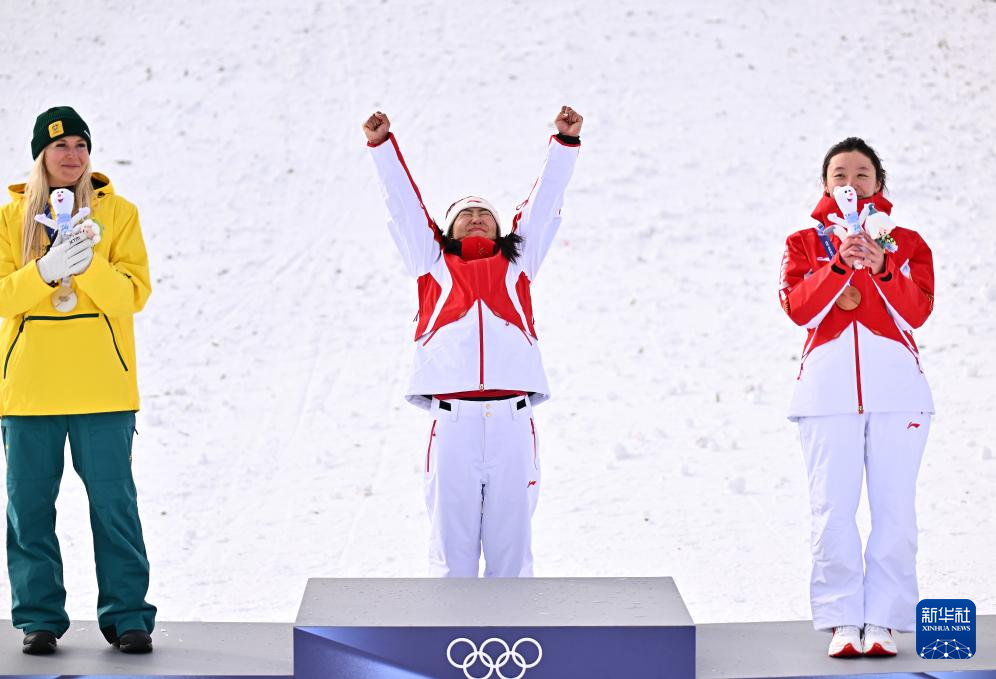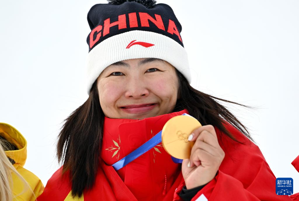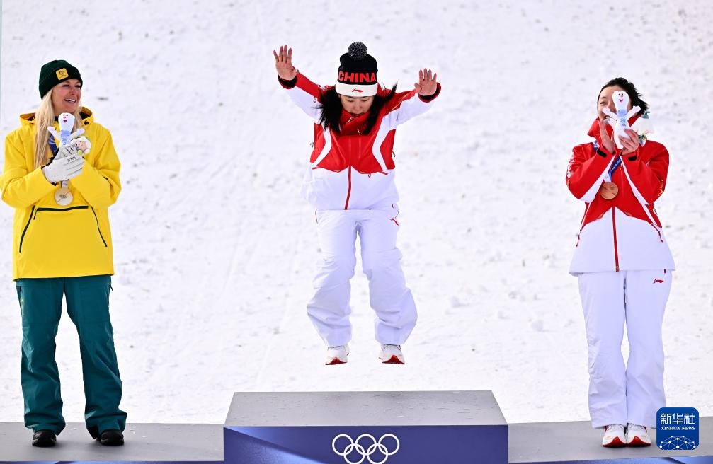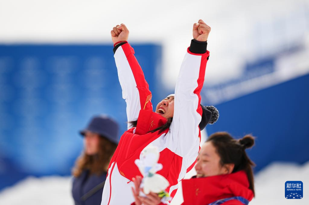 2月18日,中国选手徐梦桃在颁奖仪式上庆祝。