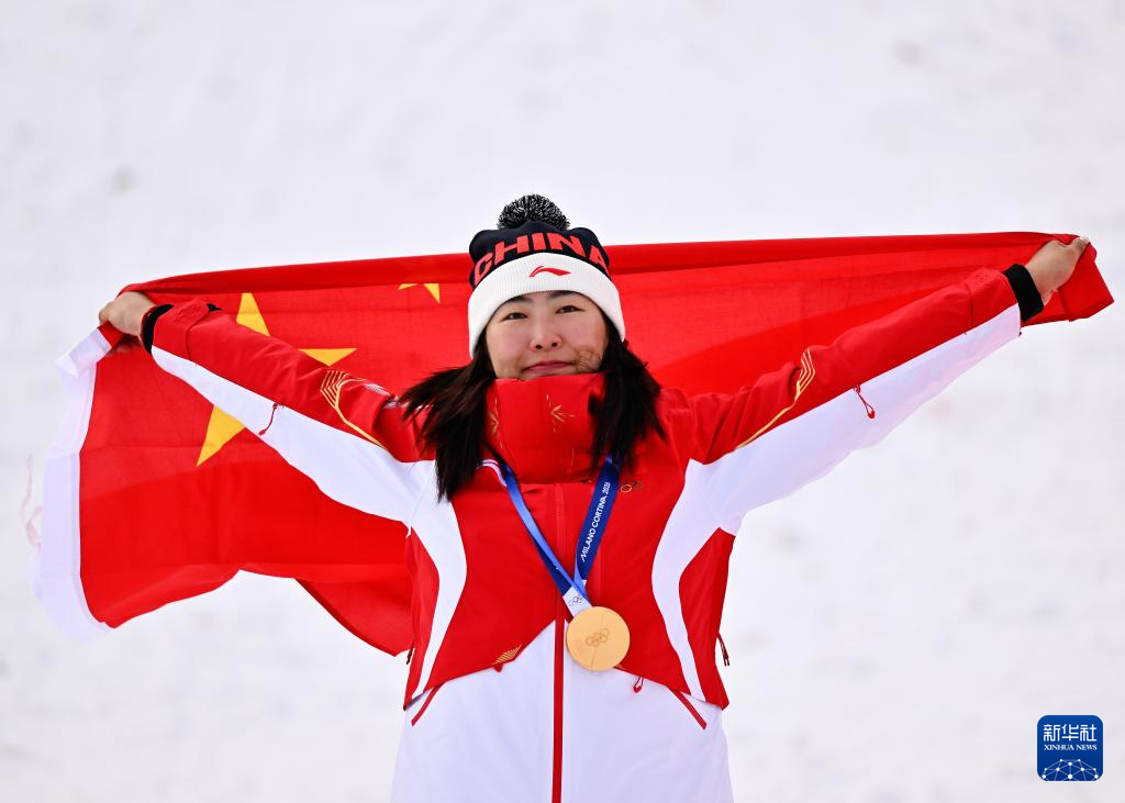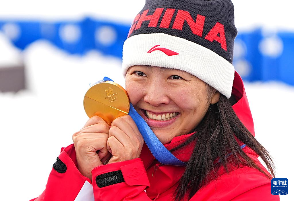2月18日,中国选手徐梦桃颁奖仪式上庆祝夺冠。