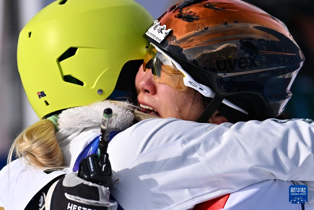 2月18日,中国选手徐梦桃(右)庆祝夺冠。