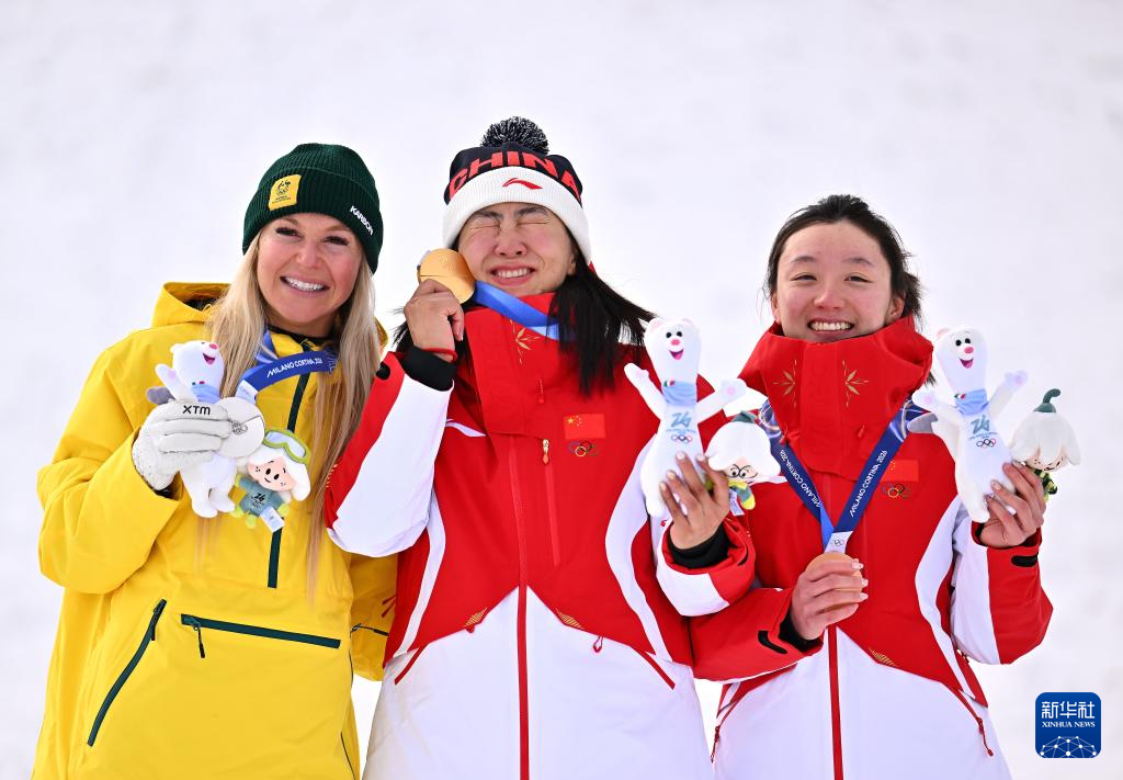 2月18日,中国选手徐梦桃(中)和队友孔凡钰(右)、邵琪庆祝夺冠。
