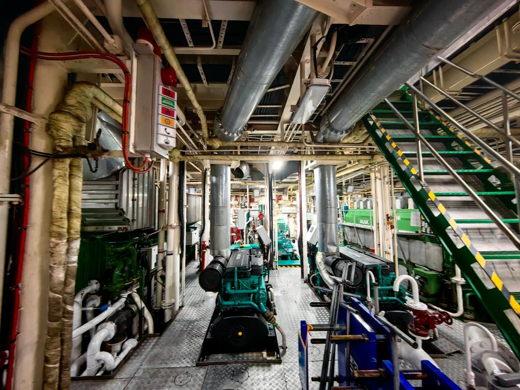 机械区是整艘船的动力中心,被各类机器占据,仅留一人宽的通道供人行走。机器林立但秩序井然,每台设备都干干净净。宗可华认真观察每台机器,记录运转情况。由于分贝过高,他跟同事用手比划,传递着只有他们才能看懂的信息。