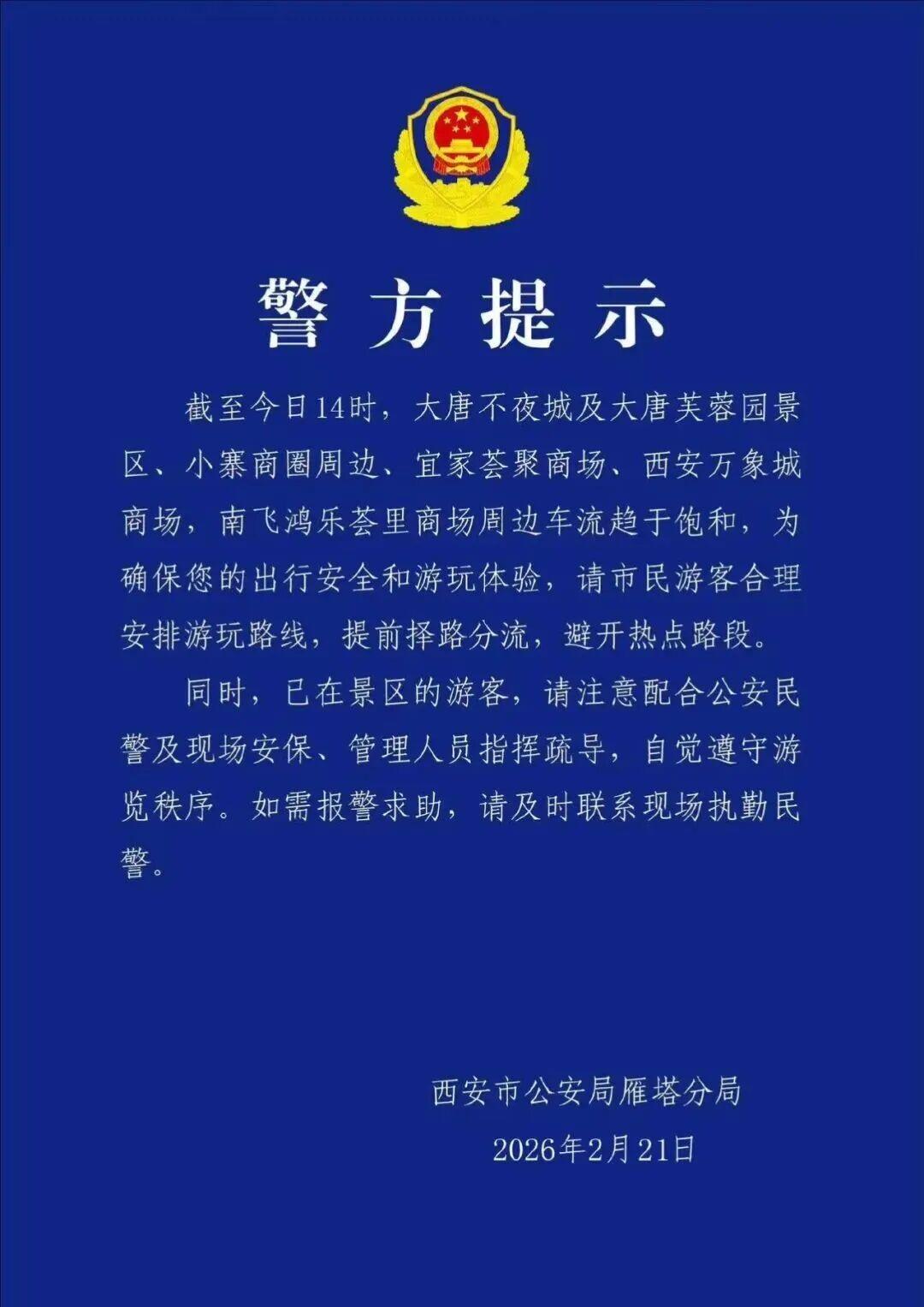 截至今日14时,大唐不夜城及大唐芙蓉园景区、小寨商圈周边、宜家荟聚商场、西安万象城商场,南飞鸿乐荟里商场周边车流趋于饱和,为确保您的出行安全和游玩体验,请市民游客合理安排游玩路线,提前择路分流,避开热点路段。