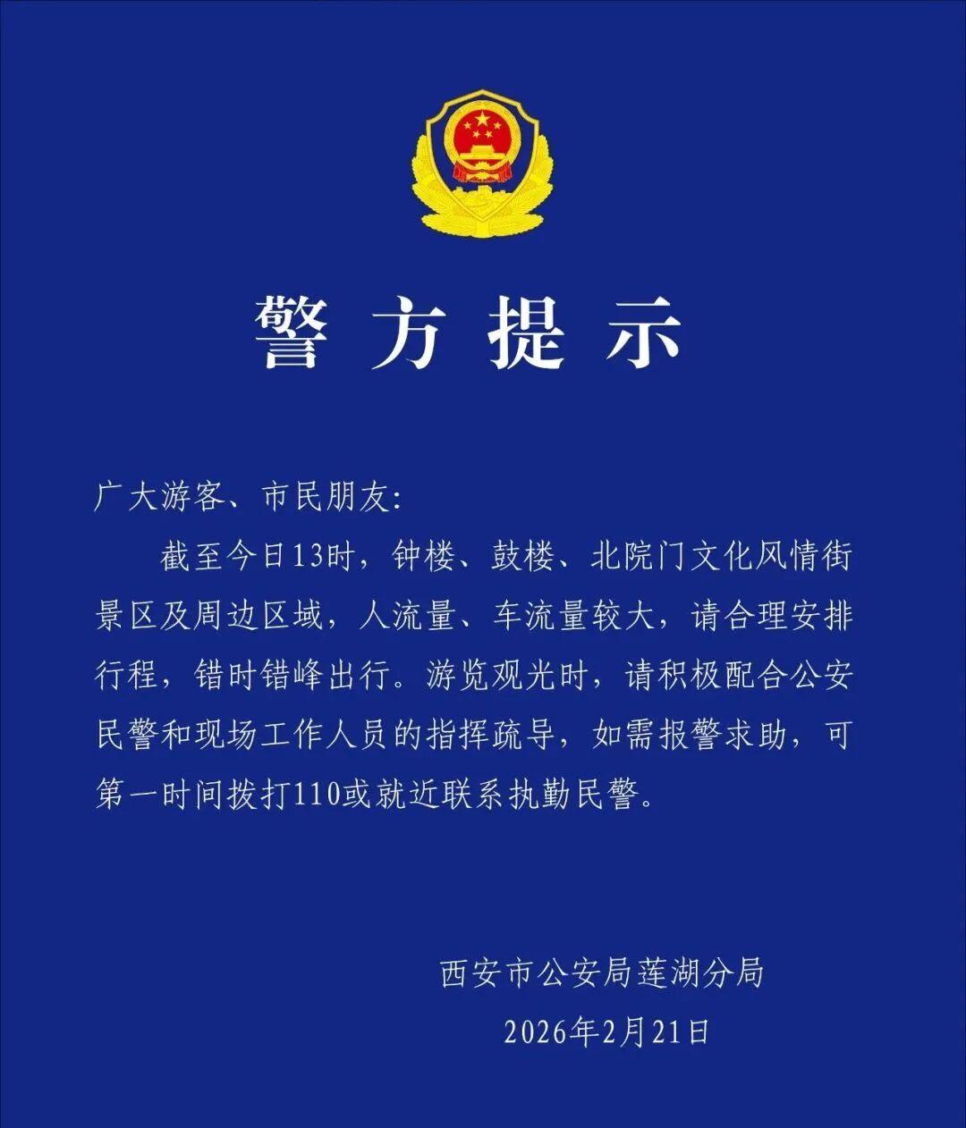 截至今日13时,钟楼、鼓楼、北院门文化风情街景区及周边区域,人流量、车流量较大,请合理安排行程、错时错峰出行。游览观光时,请积极配合公安民警和现场工作人员的指挥疏导,如需报警求助,可第一时间拨打110或就近联系执勤民警。