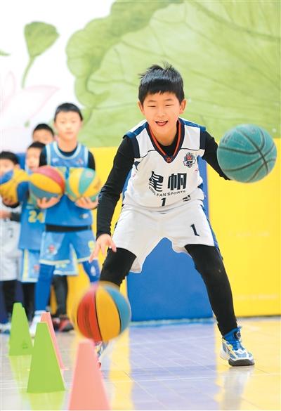 寒假期间,山东省高密市的小学生在进行篮球基本功训练。