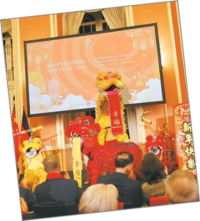 由柏林中国文化中心与柏林市政府等合作举办的2026马年“欢乐春节”新春庆典晚会日前在德国柏林市政厅举行。图为活动现场的舞狮表演。