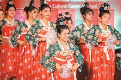 2026年中国新春灯会近期在尼泊尔勒利德布尔市的帕坦博物馆开幕。图为尼泊尔学生在开幕式上表演舞蹈《唐宫夜宴》。