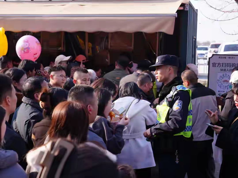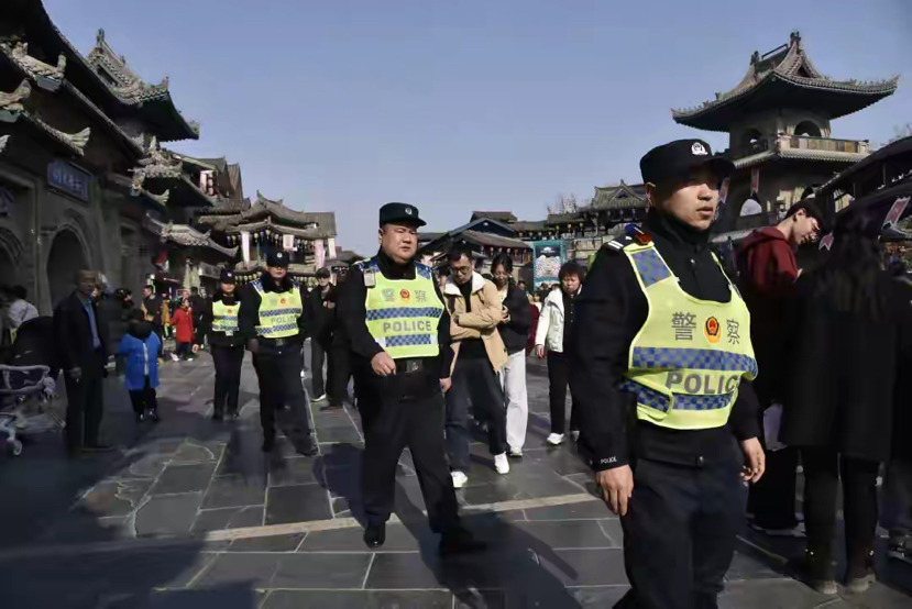 “过福年•到福地•添福气”是陕西省周至县2026年春节系列文化活动的主题,而周至水街烟火巷子作为“源来周至·多来多福”核心文旅IP的载体,以“玩主江湖”互动NPC游戏为体验,吸引着众多游客前来打卡体验,随处可见的红蓝警灯、藏蓝身影,成为这个春节“警景相融”最温暖的守护。