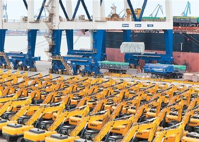 图为山东港口烟台港,出口设备在等待吊装上船。