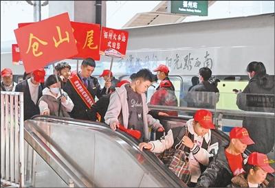 务工人员乘坐G2414次高铁返岗复工专列抵达福州火车站。