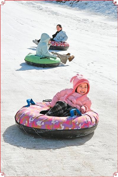 春节假期,山东省烟台市各滑雪场客流量增加,人们在冰天雪地中度过美好时光。图为游客在烟台市南里必捷滑雪公园体验滑雪圈。