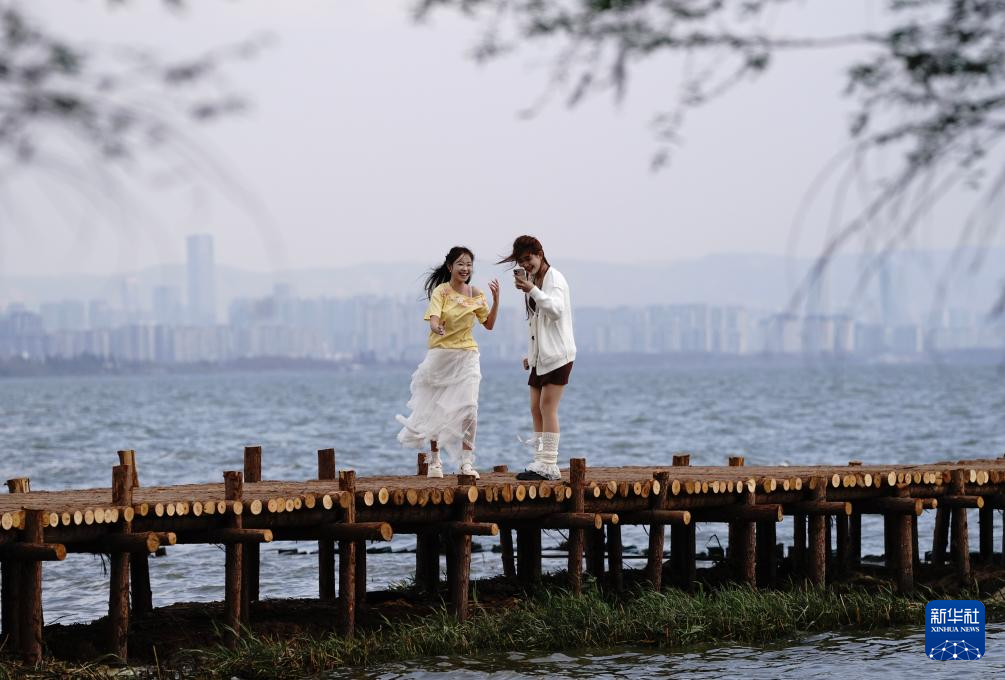 2月26日,两名游客在滇池边拍照打卡。