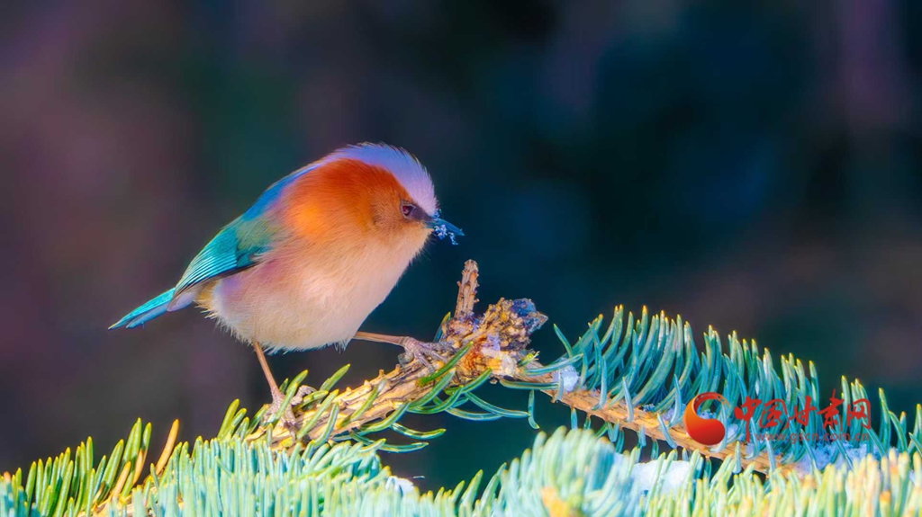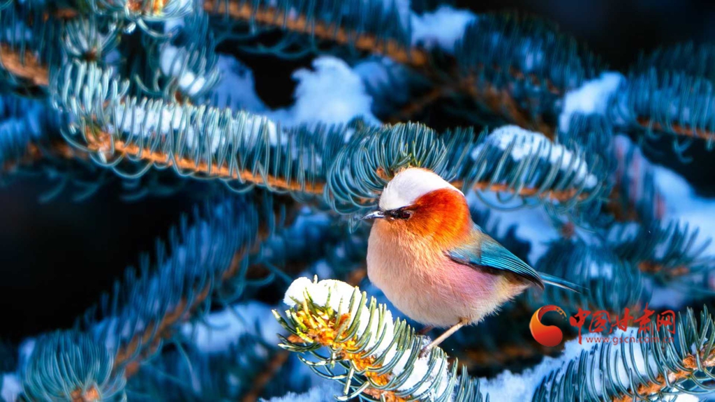 这群被誉为“祁连山精灵”的小鸟,头顶雪白羽冠蓬松如绒,仿佛戴上了一顶天然的小绒帽,棕红面颊温润似玉,在阳光下泛着柔和的光泽,蓝绿背羽如同上好的宝石,在雪色映衬下泛着金属般的质感。淡粉与橙白相间的腹羽柔和雅致,层次分明,在纯白背景的映衬下,形成强烈而和谐的视觉碰撞,它们或亭亭立于覆雪松枝,或灵巧穿梭于松针间隙,更有灵动的个体俯身探喙,啄取松针缝隙里的昆虫,一声轻脆的啄击,划破林间的清寂,却更显山野幽静,羽翼轻振间,将“雪中觅食”的鲜活图景永久定格。
