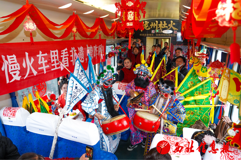 “哐当、哐当”,平凉至宝鸡的6072/3、6074/1次公益性慢火车,是穿行在陕甘交界乡间的“民生线”,也是陇州非遗坚守了八年的“流动舞台”。自2018年起,西安客运段便与陇县文旅局携手,将社火、秦鼓、剪纸等陇州非遗搬上慢火车,让这份带着乡土气息的文化盛宴,陪伴沿线群众和旅客度过了一个又一个新春。